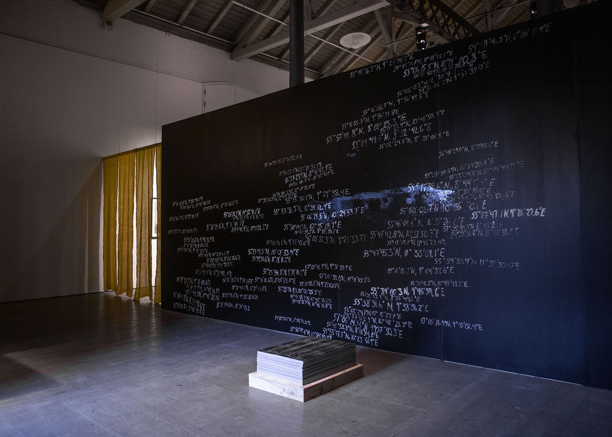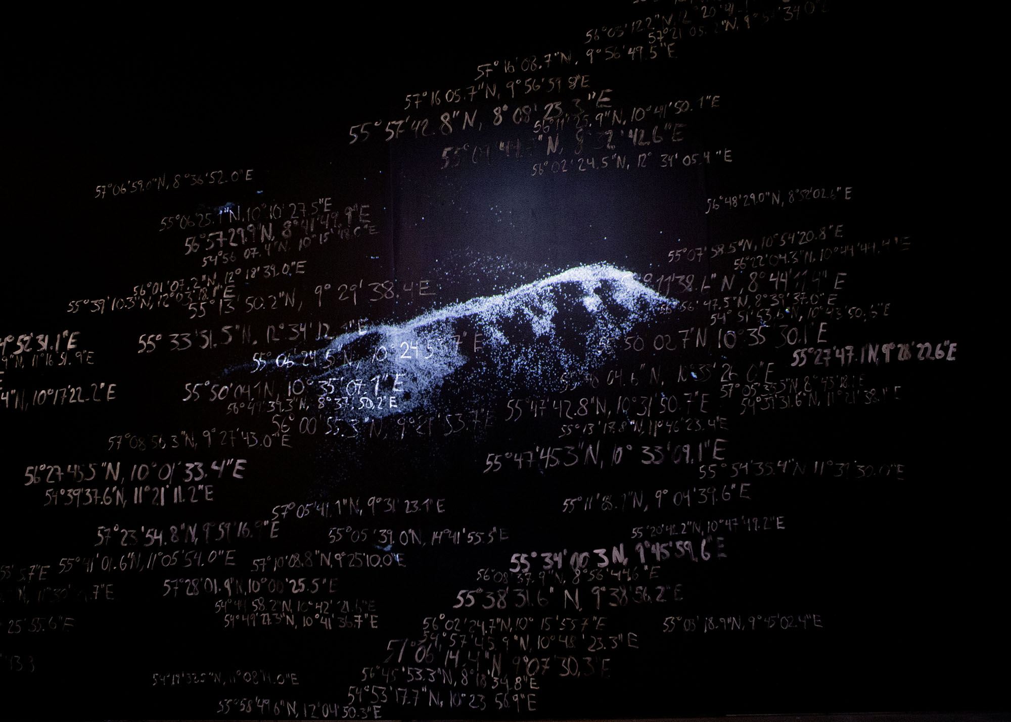 The projection shows a 3D model of a mound of chalk found in Dannemare, Lolland where the Gloslunde Refugee Asylum Center once was located. This was the first location documented at the beginning of the process of mapping the 89 Refugee Asylum Centers and Emergency Aid Centers that have been closed since 2018. The coordinates of all of these locations are written in chalk on a surface where the spinning mound of Gloslunde Refugee Asylum Center is projected.